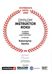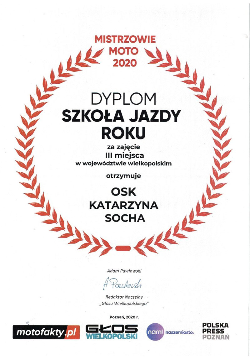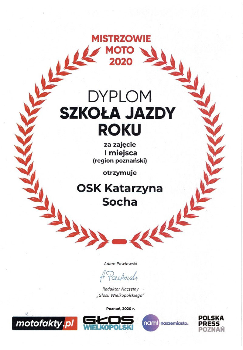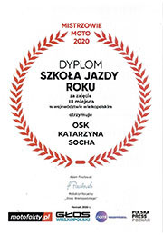 Osiągnięcia Mistrzowie Moto 2020 Instruktor roku(region poznański)I miejsce Szkoła Jazdy roku(region poznański)I miejsce Szkoła Jazdy roku(wielkopolska)III miejsce